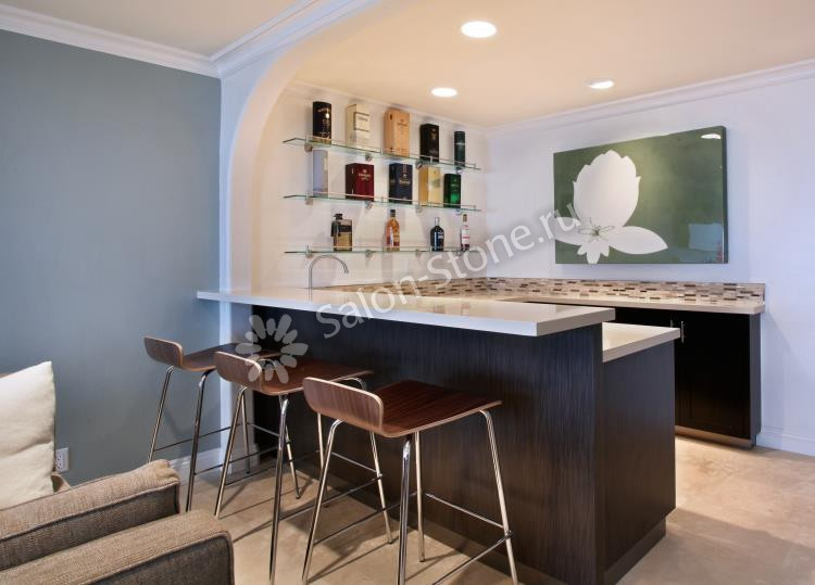 - Поверхности барных стоек из искусственного камня не впитывают влагу и не оставляют пятен, что обеспечивает легкость ухода. Для поддержания чистоты достаточно регулярно протирать изделие влажной тряпкой, что особенно ценно в условиях кухни.