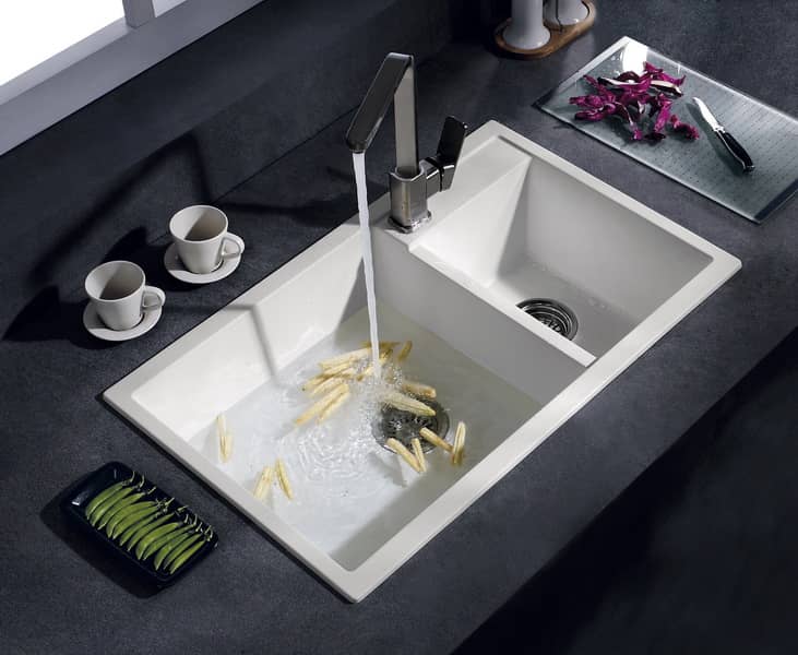 Двухсекционная мойка комфортной конструкции. Две чаши – большая для посуды и маленькая для овощей и фруктов – расположены так, что хозяйке будет удобно ими пользоваться. Прочная каменная поверхность выдерживает перепады температур и обладает антибактериальными свойствами.