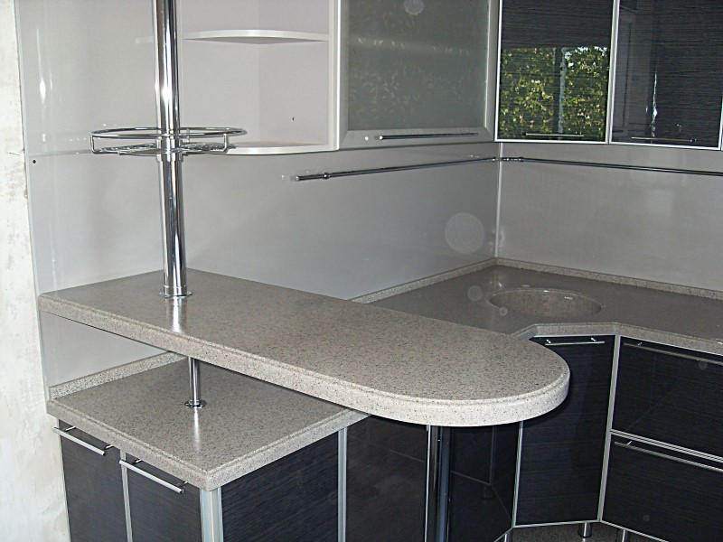 Выполняясь из синтетического камня, барная столешница для кухни отличается прекрасными эстетическими и практическими качествами. Такая поверхность не боится агрессивных внешних воздействий и отличаются высокими показателями гигиеничности.